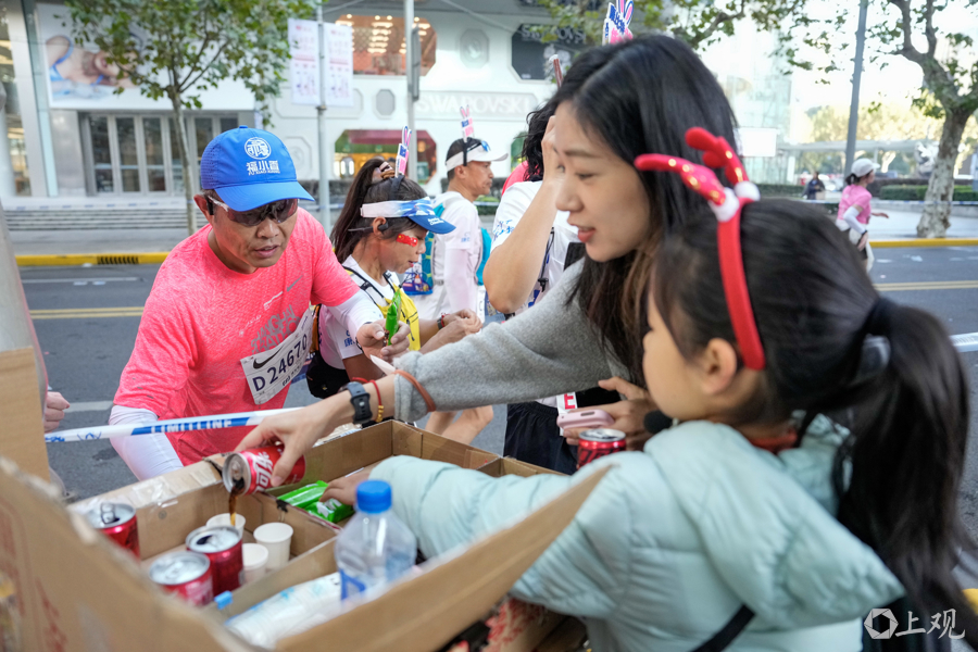本次上马未中签的杭州跑步爱好者张女士带着孩子赛前赶来上海,专程入住淮海中路赛段沿线酒店,提前冰镇好可乐为跑者们助力。